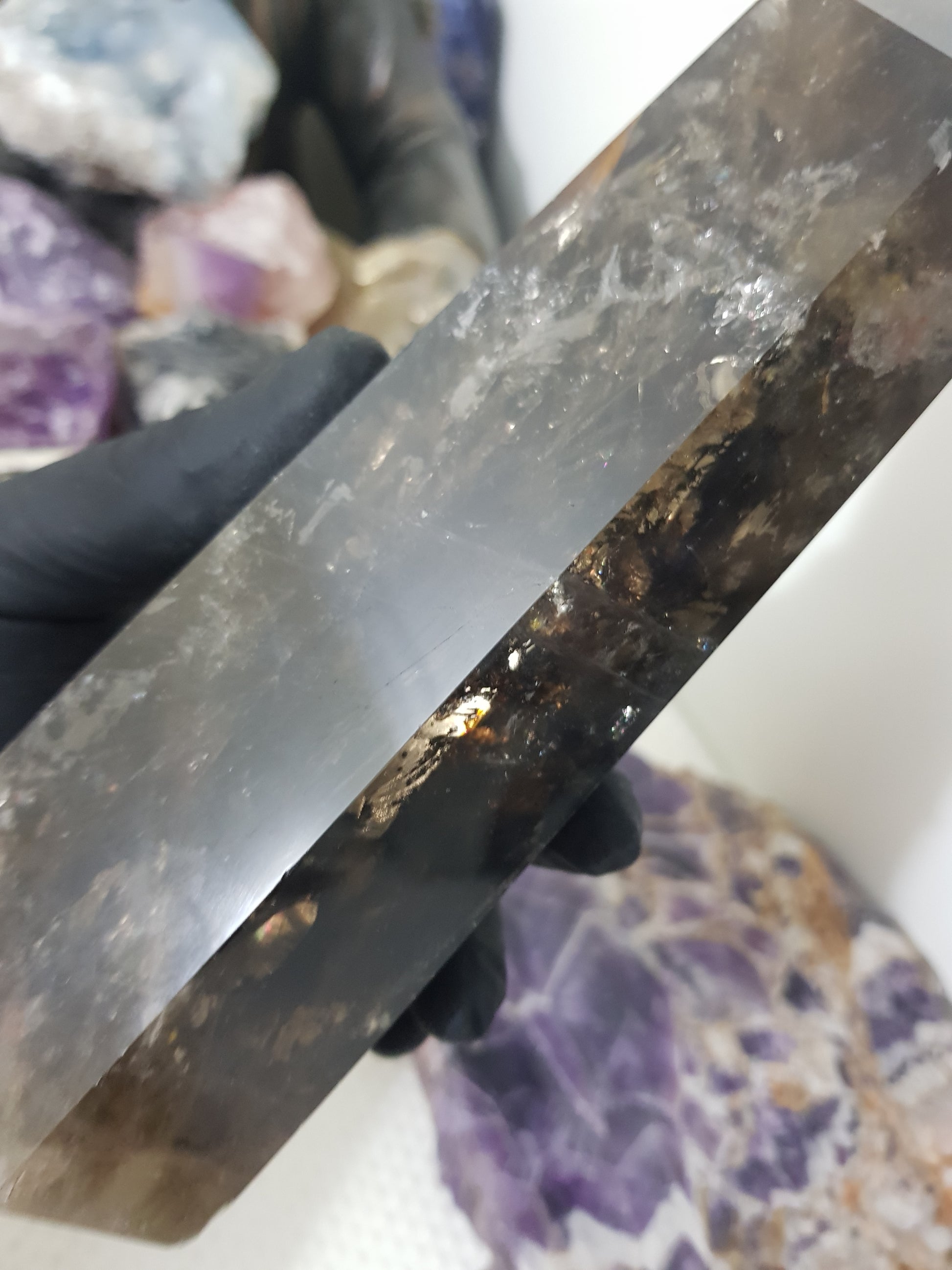 This Smoky Quartz point is a dark smoky colour and has some rainbows and many flashes.